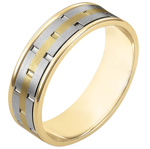 18 kt two-tone hand made comfort fit Wedding Band 6.5 mm wide. There are carved notches around the whole ring. The ring is a matte finish. The edges are polished. Different finishes may be selected or specified.