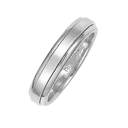 18Kt White gold classic wedding band. The ring is about 5.0 mm wide and comfort fit. The center of the ring has a soft satin matte finish and the outer edges are polished. Different finishes may be selected or specified.