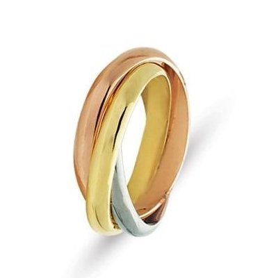 18Kt Tri-Color gold Russian wedding band. There are 3 interlocking bands. Each ring is about 3.0mm wide. The ring is polished. Different finishes may be selected or specified.