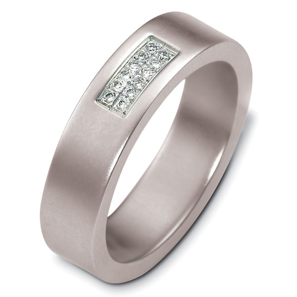 Platinum diamond, comfort fit, 6.0mm wide wedding band. The total diamond weight is 0.06 ct tw and the quality is VS1-2 in clarity and G-H in color. There are about 12 round brilliant cut diamonds, each measures 0.005 ct. The ring is a matte finish. Different finishes may be selected.