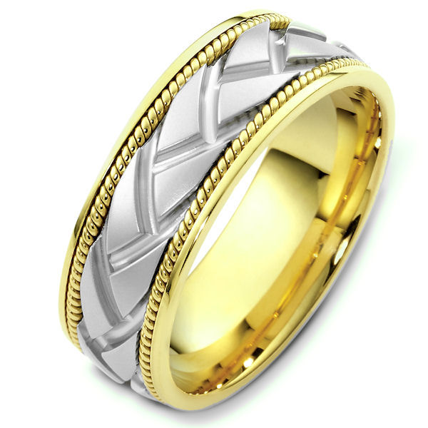 18kt Two-tone gold handcrafted, carved, comfort fit, 8.0mm wide wedding band. The center of the ring is carved and one hand crafted rope on each side of the carving. It is 8.0mm wide and comfort fit.