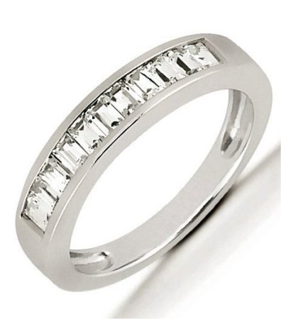 Platinum anniversary band. The ring holds 11 straight baguette cut diamonds, each measures 2x1.5 mm. The diamonds are approximately 0.33 ct tw, VS1-2 in clarity, very clean and G-H in color, near colorless to colorless. The diamonds are set in a channel. The band is about 3.5 mm wide. The finish is polished. Different finishes may be selected.