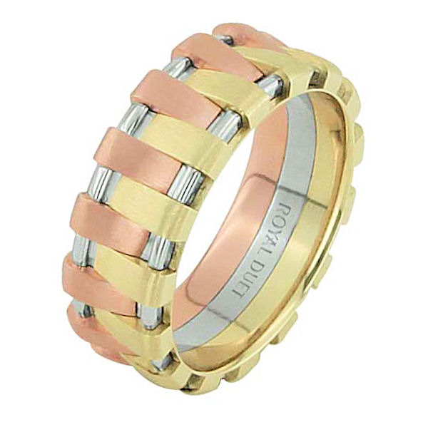 18 kt tri-color gold, comfort fit, 7.0 mm wide, wedding ring. The band has a beautiful combination of rose, yellow, and white gold. There is a mix of brushed and polished finishes. Other finishes may be selected or specified.