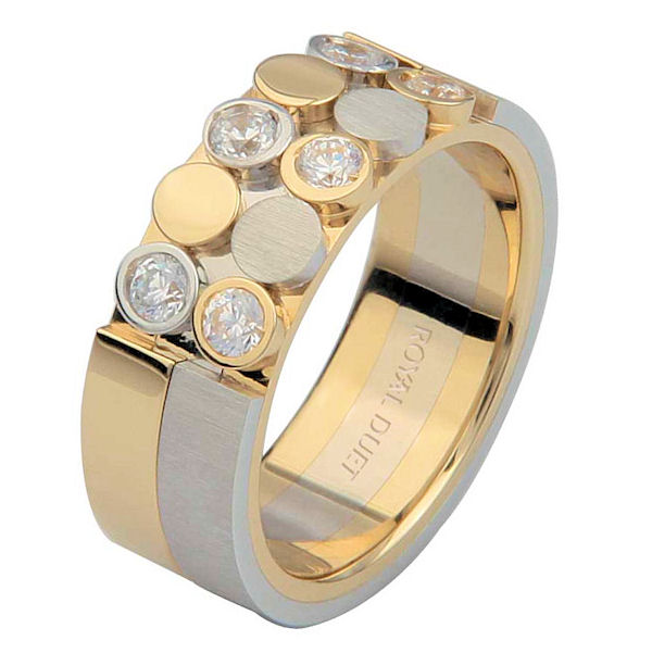 14 kt two-tone gold, comfort fit, 7.0 mm wide, diamond wedding ring. The band combines white and yellow gold to create a beautiful design with the diamonds set in the ring. It has approximately 0.42 ct tw round brilliant cut diamonds, that are VS1-2 in clarity and G-H in color. The white gold has a brush finish and the yellow gold has a polished finish. Different finishes may be selected or specified.