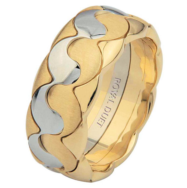 One 14 kt two-tone gold, comfort fit, 8.5 mm wide, wedding band. The ring combines yellow and white gold together to create a beautiful design. It has a mixture of brushed and polished finishes. Different finishes may be selected or specified.
