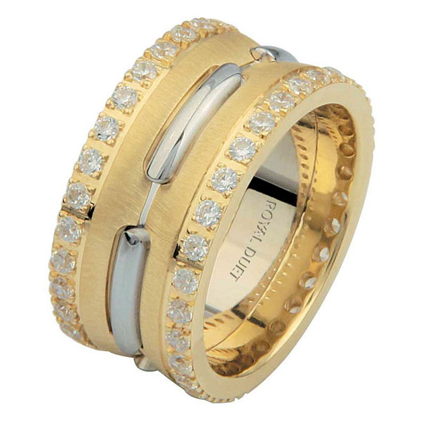 18 kt two-tone gold, comfort fit, 10.2 mm wide, diamond eternity wedding ring. The band has a beautiful mixture of white and yellow gold. There are diamonds set around the whole band on each side. It has approximately 1.05 ct tw round brilliant cut diamonds, that are VS1-2 in clarity and G-H in color. The total weight of the diamonds may vary depending on the size of the ring.