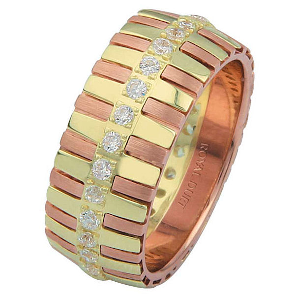 18 kt rose and yellow gold, comfort fit, 8.20 mm wide, diamond eternity ring. The band has unique combination of yellow and rose gold with diamonds set in the center. It has about 0.60 ct tw round brilliant diamonds, that are VS1-2 in clarity and G-H in color. The total weight of diamonds may vary depending on the size of the ring.
