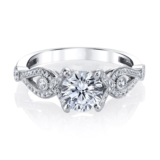 Platinum, sculptural, diamond engagement ring. There are about 75 round brilliant cut diamonds set in the ring. The diamonds are about 0.21 ct tw, VS1-2 in clarity and G-H in color. Center stone is sold separately and for any size. Pictured is a 1.0 carat diamond.