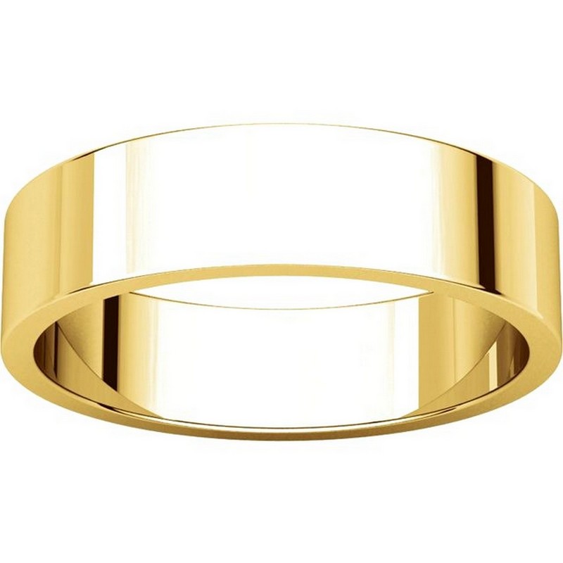 14kt gold, plain, 5.0mm wide, flat wedding band. The wedding band is a polished finish. Different finishes may be selected or specified.