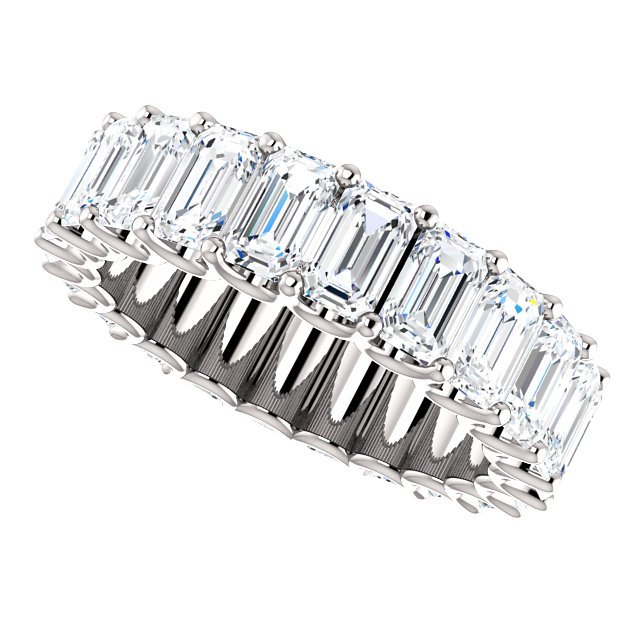 Platinum diamond eternity band made with all matching emerald shape diamonds. In size 6.0 the ring holds approximately 21 diamonds with approximate total weight of 7.0ct. Diamonds are graded as VS in clarity F in color..