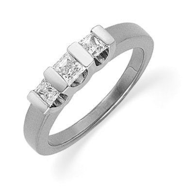14 K white gold three princess cut brilliant diamond anniversary band. The diamond total weight is approximately 0.50 ct. The diamonds are graded as VS1-2 in clarity G-H in color. The finish on the ring is polished. Other finishes may be selected or specified.
